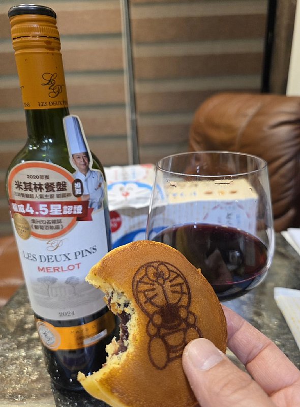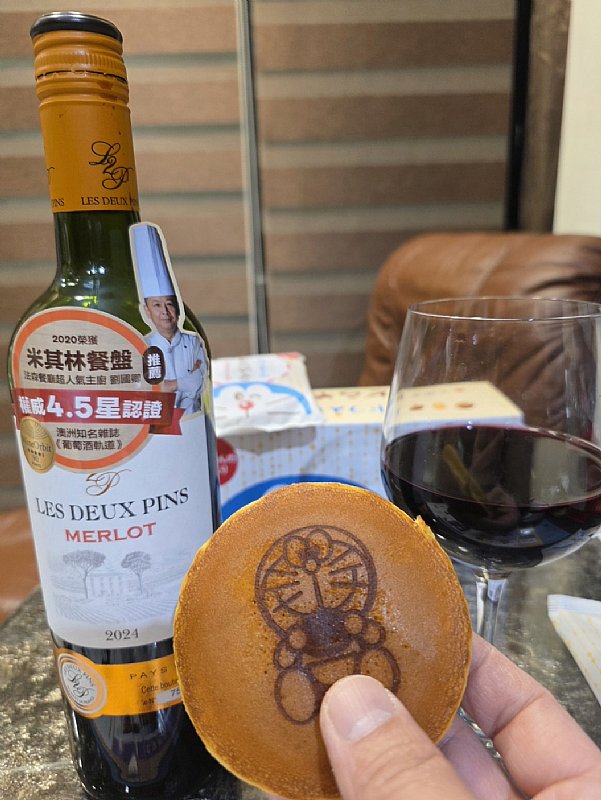 單飲少了下酒菜,隨手拿了兒子的哆啦A夢銅鑼燒餅配酒。想不到這瓶酒也能完美「解甜膩口」,簡直是台灣人餐桌上的「百搭天王」。