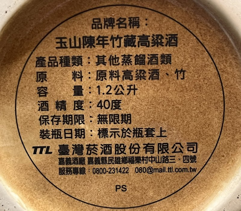 4.玉山陳年竹藏高梁1.2公升瓷瓶~1,200公尺