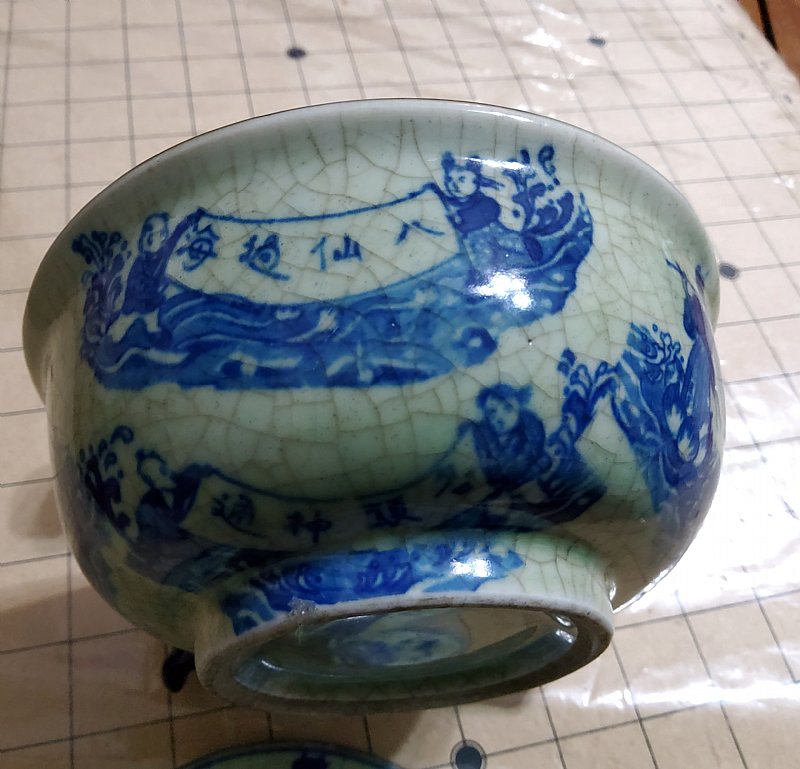 外壁紋飾:碗身繪有青花八仙過海人物故事圖,並配有「通神」二字的文字標記。