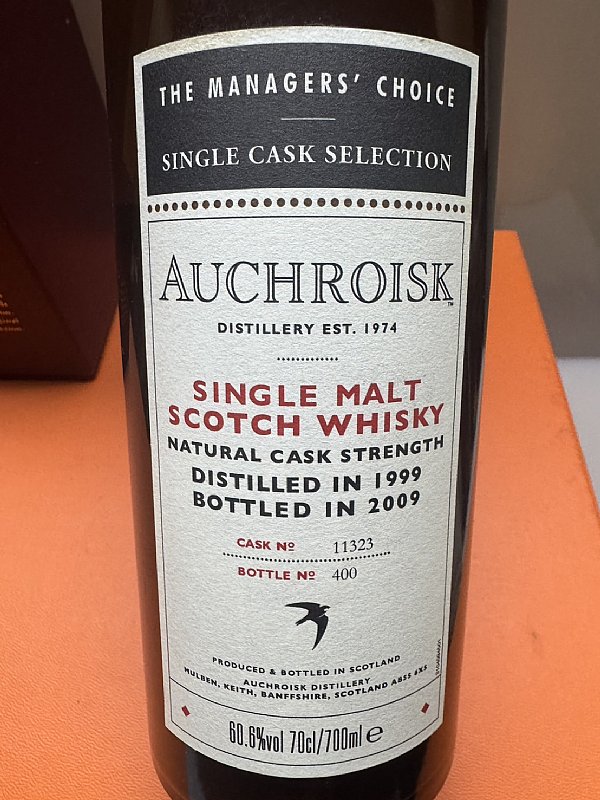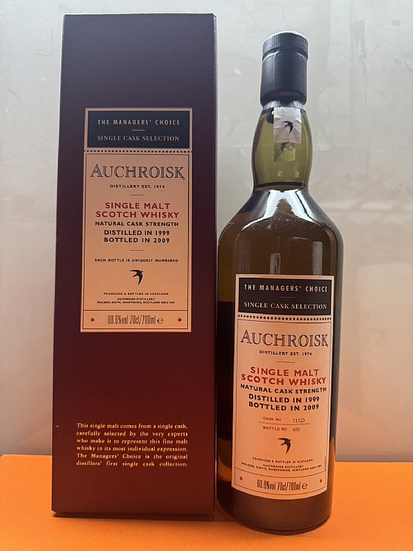 這是一瓶來自 Auchroisk(奧赫魯伊斯克) 酒廠的「The Managers' Choice」系列單桶原酒,屬於廠方精選的高品質桶強威士忌。