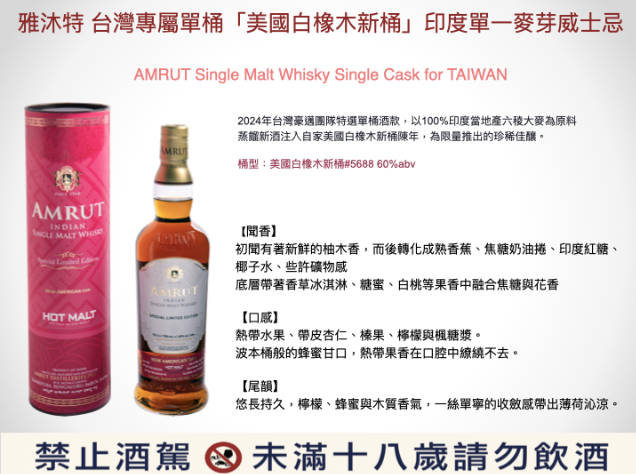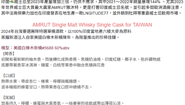 香氣 初聞有著新鮮的柚木香,而後轉化成熟香蕉、焦糖奶油捲、印度紅糖、椰子水、些許礦物感 底層帶著香草冰淇淋、糖蜜、白桃等果香中融合焦糖與花香。 口感 熱帶水果、帶皮杏仁、榛果、檸檬與楓糖漿。 波本桶般的蜂蜜甘口,熱帶果香在口腔中繚繞不去。 尾韻 悠長持久,檸檬、蜂蜜與木質香氣,一絲單寧的收斂感帶出薄荷沁涼。
