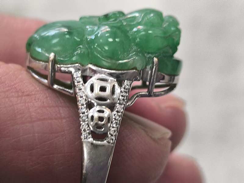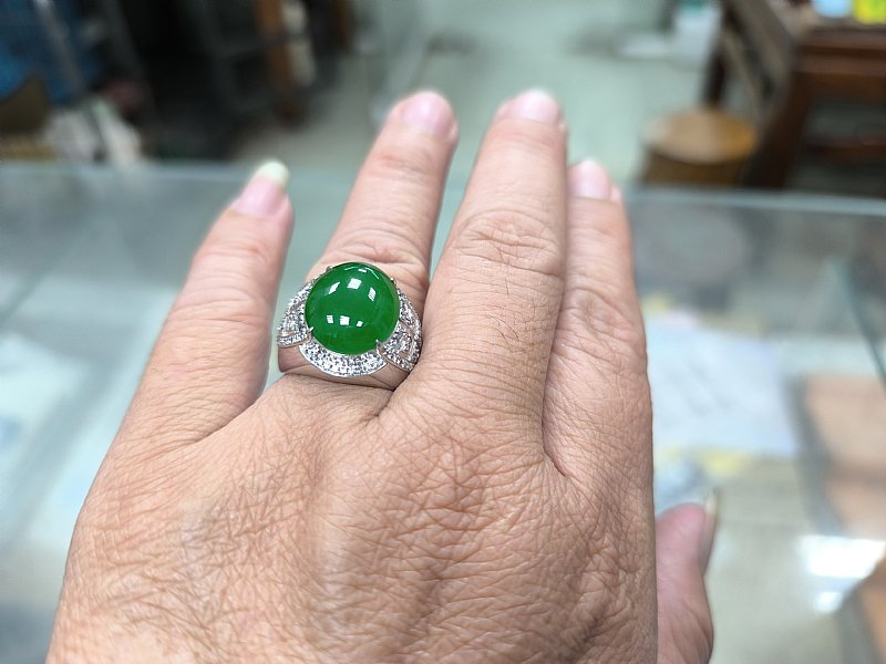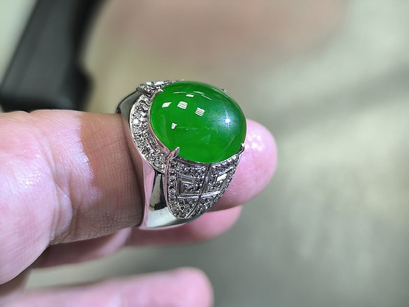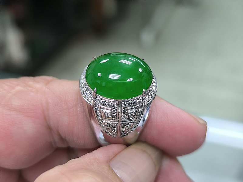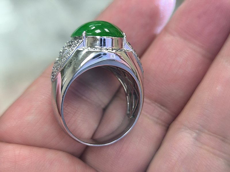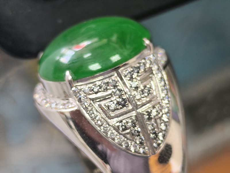 綠蛋面男戒 18k加鑲104顆小鑽。 蛋面長17寬14厚7 mm 內徑21mm 售69000