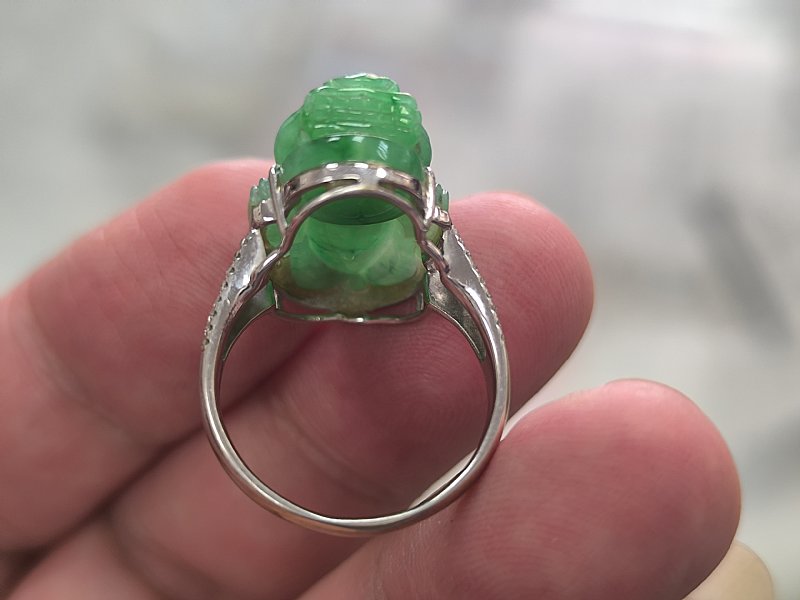 綠蛋面男戒 18k加鑲104顆小鑽。 蛋面長17寬14厚7 mm 內徑21mm 售69000.....售出