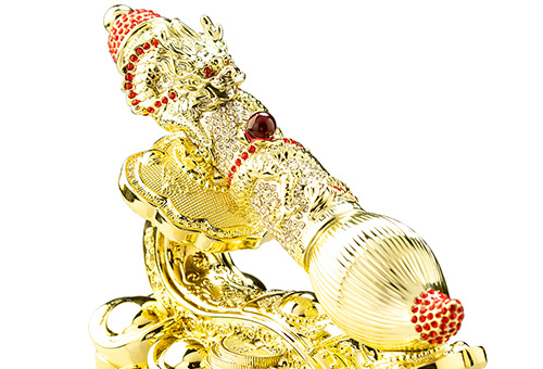 「大筆財富58度金門高粱酒」由國際珠寶協會指定設計團隊精心打造,筆身以手工鑲嵌668顆紅寶石及水晶鑽,象徵「路路發」的美好寓意。筆身上的鑽大筆設計更是一大亮點,這支雕工精細的「賺大筆」不僅可拿起來把玩,還象徵了大筆進財與金榜題名的吉祥寓意,極具收藏價值。