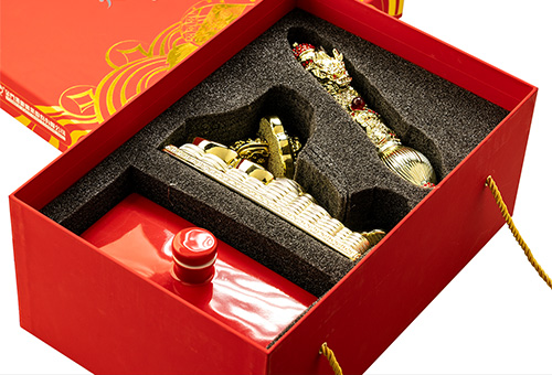 酒瓶四方造型融合了傳統文化與現代美學,古時以四方器皿來存放金銀的器具,也被稱為財庫,整體造型四平八穩,搭配上如意底座則寓意著做事穩重、細心,待友言語有分寸,廣納四方財源、合作共贏大筆財富。瓶身設計不僅是藝術品,更展現了對財富與好運的美好祝福。