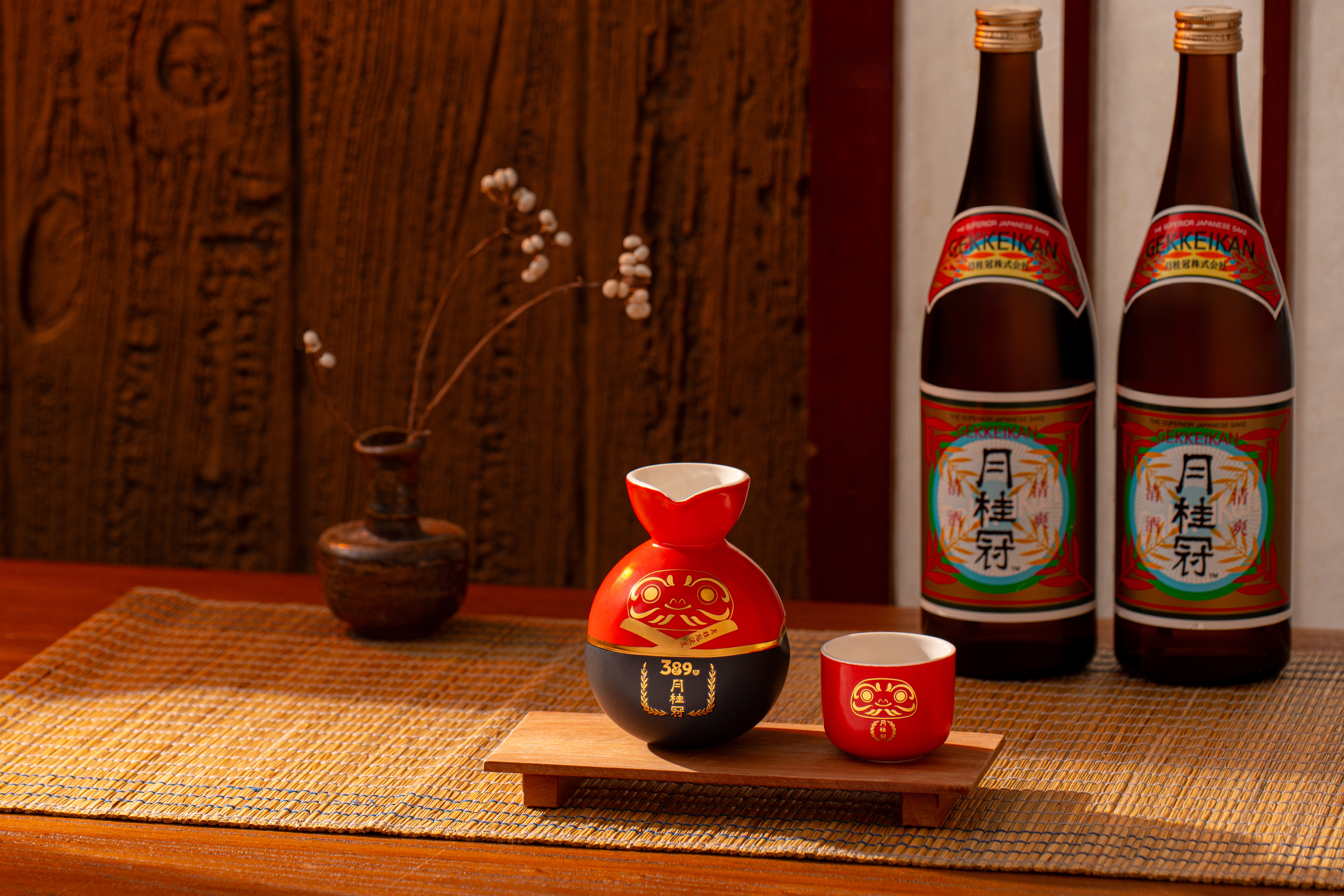 霧面硝光紅黑金開運配色不倒翁壺杯,搭配月桂冠經典清酒,入口圓潤細緻,收藏送禮都加分。