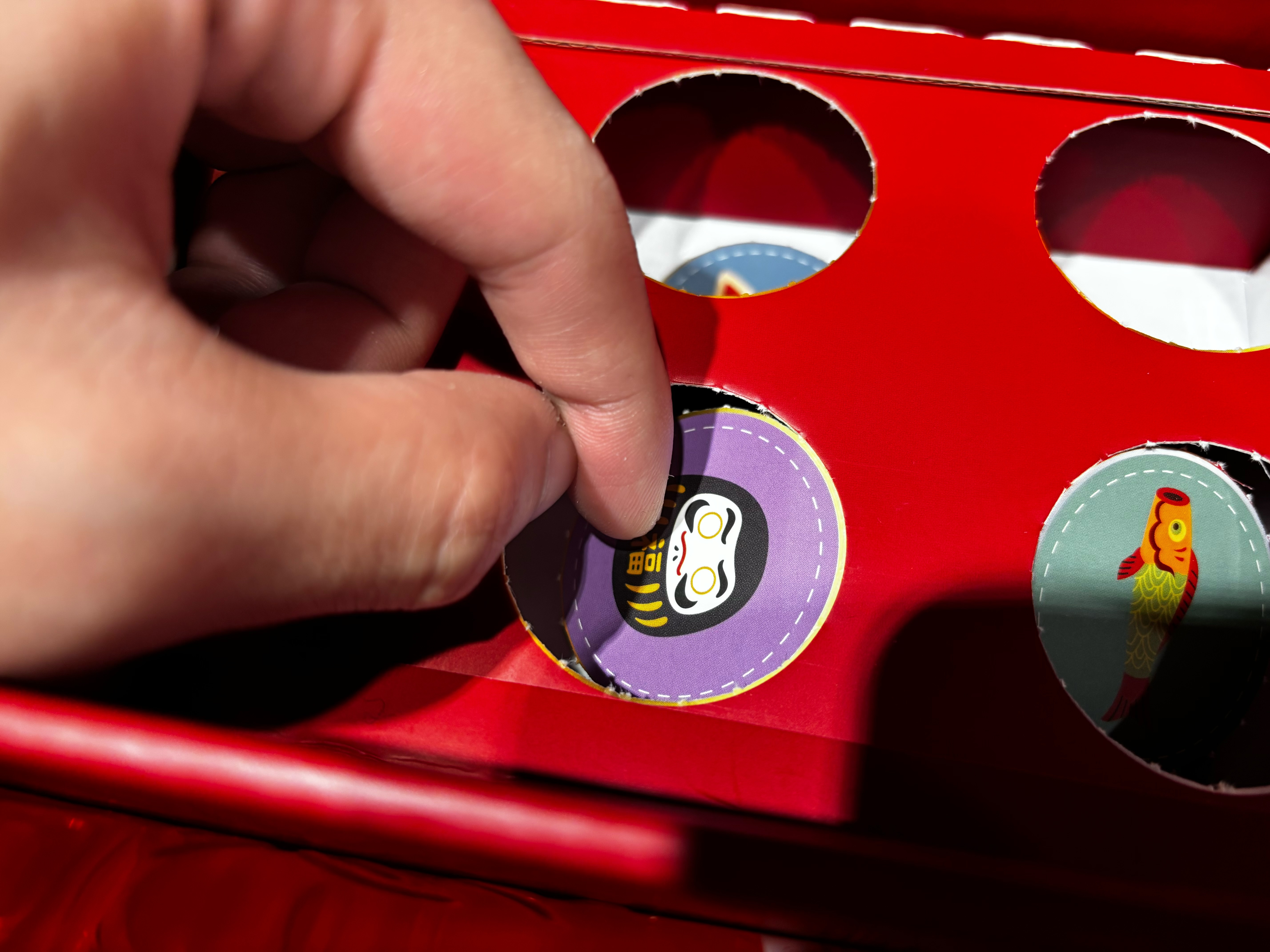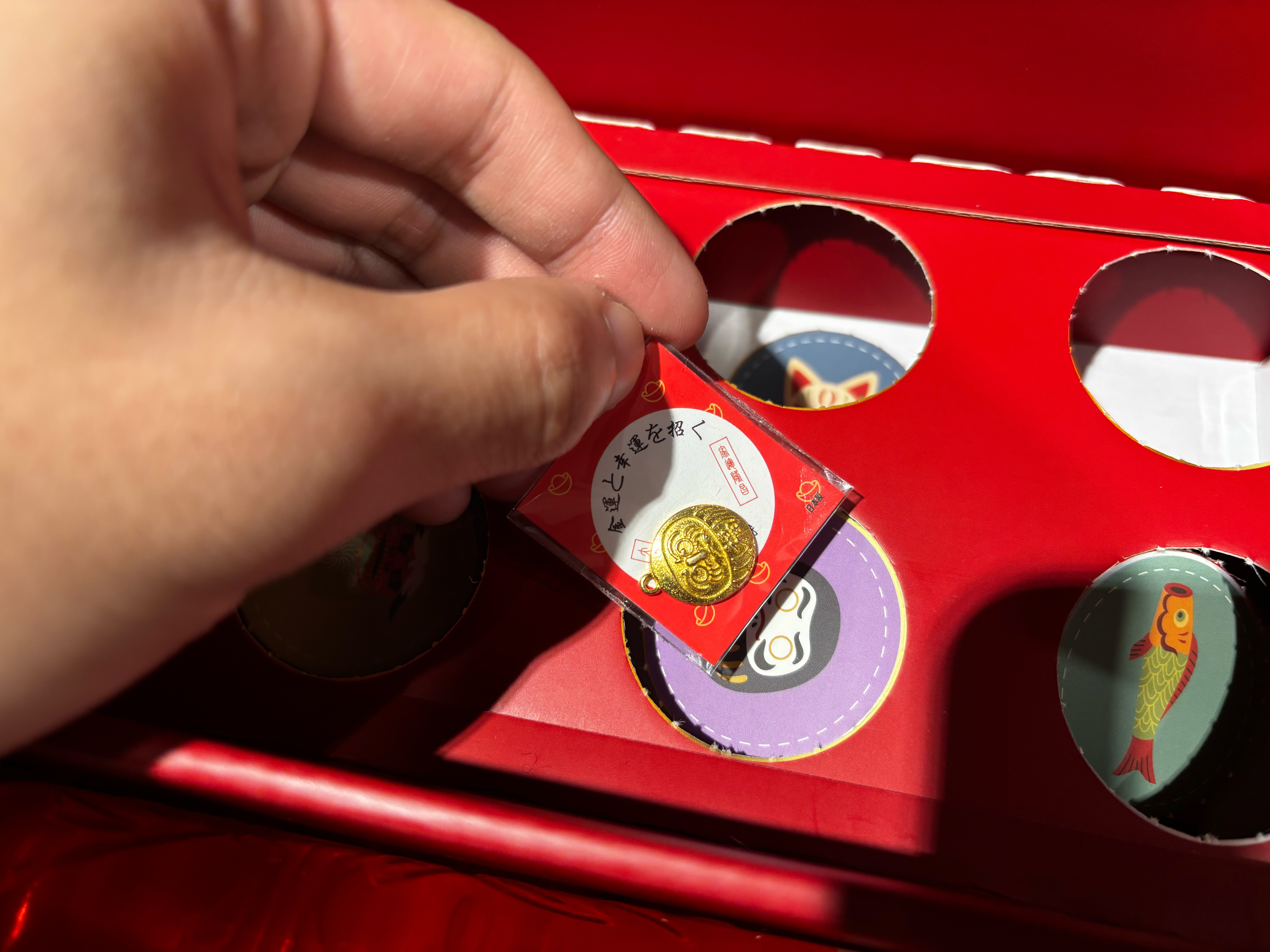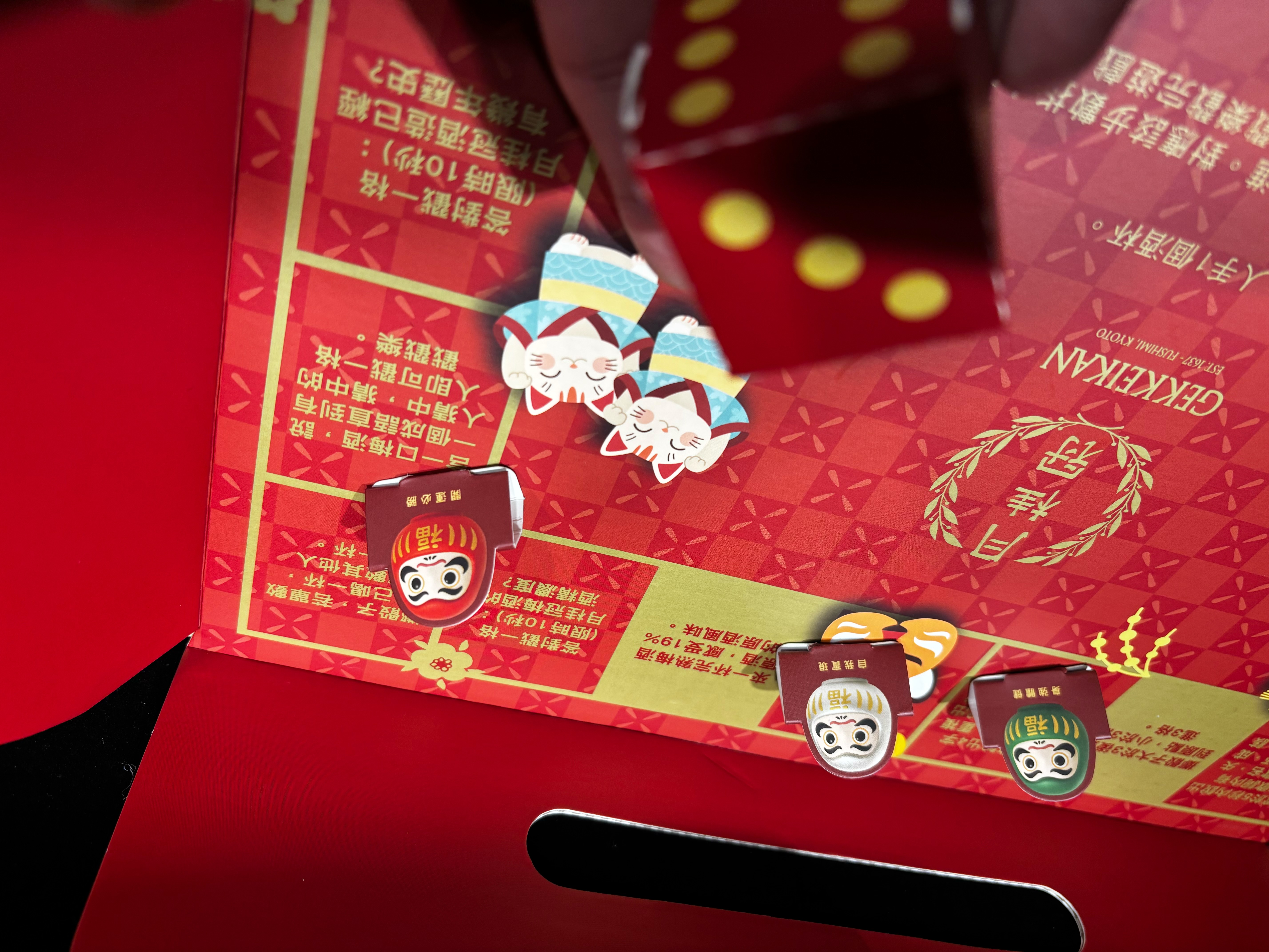 打開盒子,裡面不只有酒,還附上精緻的跳棋與骰子,更藏了一整盒的招福戳戳樂──小編抽到超萌金幣不倒翁,每一個都是吉祥小物,邊玩邊積攢好運,互動感十足!