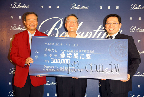 以實際行動積極推動高爾夫運動發展的百齡罈,11/14日再度寫下企業贊助扶植台灣高爾夫球發展新頁;全球限量八瓶、台灣唯一一瓶的絕世珍稀名釀--百齡罈40年蘇格蘭威士忌慈善競標活動正式開跑,舉辦全台首創郵輪高爾夫慈善揮桿,在百齡罈品牌傳承總監比爾.柏吉斯(Bill Bergius),以及IT教父施振榮、高球國手謝敏男、興農牛當家投手陽建福、名模林嘉綺與名導演李崗等人的共同參與下,揮出歷史性的一桿,為百齡罈與台灣高球永續發展的真時刻見證!  | | 左起高球國手謝敏男、HOPE會長施振榮、名模林嘉綺、台灣保樂力加總經理危永標、百齡譚傳承總監Bill Bergius | 百齡罈40年蘇格蘭威士忌慈善義賣公佈暨郵輪揮桿記者會,於11月14日下午於淡水河景觀河濱公園關渡碼頭舉行,以前所未有的氣勢格局,為全球限量八瓶、全台唯一一瓶的百齡罈40年蘇格蘭威士忌慈善競標開跑造勢。  | | 百齡譚40年蘇格蘭威士忌慈善義賣在此郵輪公怖正式開始 | 郵輪上企業家、名流、體育名人及名模等冠蓋雲集,除爭相目睹絕世珍釀百齡罈40年蘇格蘭威士忌外,更以支持台灣高爾夫球發展的熱忱,參加全台首創郵輪揮桿,挑戰浮島果嶺,為支持「HOPE高爾夫希望工程促進會」慈善揮桿。受邀出席的貴賓名人或體壇球星每揮一球到淡水河上的浮島果嶺,台灣保樂力加便捐出二萬元慈善基金給「HOPE高爾夫希望工程促進會」,期待藉此培育更多台灣優秀的選手站上國際舞台。  |  | | 百齡罈40年僅僅生產八瓶 每一瓶都以鑲金序號彰顯其珍貴崇高的價值與不凡的意義 | 百齡譚40年蘇格蘭威士忌慈善義賣公佈暨郵輪揮桿浮島果嶺 | 實現品牌承諾!全球八瓶無價珍藏 百齡罈40年蘇格蘭威士忌慈善競標為公益 百齡罈40年蘇格蘭威士忌僅僅生產八瓶,每一瓶都以鑲金序號彰顯其珍貴崇高的價值與不凡的意義。此次為扶植台灣高爾夫球發展,特別拿出百齡罈40年蘇格蘭威士忌進行慈善競標,義賣所得金額將全數捐給「HOPE高爾夫希望工程促進會」做為培育菁英及推廣活動用途,不僅對台灣高爾夫球運動之支持不遺餘力,更以品牌資源推動台灣球壇與全球接軌。  | | 序號No. 1的百齡罈40年蘇格蘭威士忌獻給首屆百齡罈冠軍盃新任冠軍得主 | 台灣保樂力加總經理危永標表示:「序號No. 1的百齡罈40年蘇格蘭威士忌在今年三月正式獻給首屆百齡罈冠軍盃新任冠軍得主麥道威爾,而台灣唯一的一瓶為序號No. 5也將為扶植台灣高爾夫球計劃獻出,做為慈善義賣之公益用途,號召卓越名流響應台灣高爾夫球的推廣!」  | | 積極推動高爾夫發展的百齡罈,再度寫下企業贊助扶植台灣高球發展新頁 | 百齡罈不僅在2008年初宣佈,將連續三年冠名贊助舉辦由歐巡賽認可之「百齡罈冠軍盃(Ballantine’s Championship)」,創下2008年酒商贊助舉辦之職業高爾夫賽最高總獎金紀錄,並爭取台灣高壇新人蔣宸豑、詹世昌參與歐巡賽賽事之機會、拓展台灣新一代好手的國際參賽經驗,除此之外,百齡罈也將持續將資源做更有效的整合及運用,以具體的計劃協助台灣高爾夫選手,為台灣高爾夫運動的發展盡一份心力。百齡罈近期也針對全台各地的高爾夫練習場及球場等,以更深入更積極的方式推廣高爾夫,讓更多消費者有機會體驗這項迷人的運動。 超越一世紀優異傳承 百齡罈40年蘇格蘭威士忌為極致綻放 百齡罈傳承總監比爾.柏吉斯盛讚:「百齡罈40年蘇格蘭威士忌是由百齡罈首席調酒師山帝.希斯拉特別自蘇格蘭四大產區的庫藏酒窖中,親自精選數十種40年以上威士忌調製,其中甚至包含數種已停產之稀有威士忌,稱其為絕世佳釀可謂名副其實!其奢華絲綢及奶油般柔滑質地的酒感,與豐厚甜柑橘味產生絕妙融合,極致的口感乃其他威士忌所無可比擬。」  |  | | 百齡譚品牌傳承總監Bill Bergius與威士忌達人姚和成相見歡 | 而台灣威士忌達人姚和成與百齡罈傳承總監比爾.柏吉斯也在此次盛會中重逢相見歡,兩人都榮獲蘇格蘭威士忌產業最高榮耀-蘇格蘭雙耳小酒杯執持者協會終身會員,能夠獲此資格者均是對相關產業有卓著貢獻的人,目前全世界僅約1600人左右。同為蘇格蘭威士忌愛好著,兩人份外相惜,比爾表示:「百齡罈有著歷史悠久的優異傳承,不僅是廣受歡迎的蘇格蘭威士忌品牌而已,更引領超越一世紀來優質蘇格蘭威士忌的蘊育與成形。」 台灣保樂力加特別藉此難得的機會,邀請比爾帶領郵輪上的貴賓一同品味百齡罈17、21、30年蘇格蘭威士忌,在比爾無比熱忱與浩瀚的經驗交流中,賓客、選手們在淡水河畔享受百齡罈高年份威士忌的香醇口感頂級品味的同時,也能體驗郵輪揮桿的獨特享受。 企業名流齊聚力挺 見證全台首創郵輪揮桿 競標百齡罈40年為公益 施振榮籲社會名流雅士共襄盛舉 百齡罈郵輪慈善揮桿為全台首見,吸引許多高爾夫球愛好者與名流雅士參與,在遊歷淡水河同時,並於甲板上進行高爾夫揮桿,可謂畢生難忘的郵輪揮杆經驗,呼應百齡罈「真時刻 最深刻」的頂級體驗;每位受邀出席貴賓有兩次揮桿機會,只要揮捍成功上果領,百齡罈公司每一球就捐二萬元慈善基金給HOPE高爾夫希望工程促進會。  |  | | HOPE會長施振榮揮桿上果領,台灣保樂力加危永標總經理再捐二萬元 | HOPE高爾夫希望工程促進會會長施振榮表示:「HOPE高爾夫希望工程促進會成立三年多,致力於高爾夫運動的推廣外也積極向下紮根,希望能永續台灣高球菁英的培植,讓