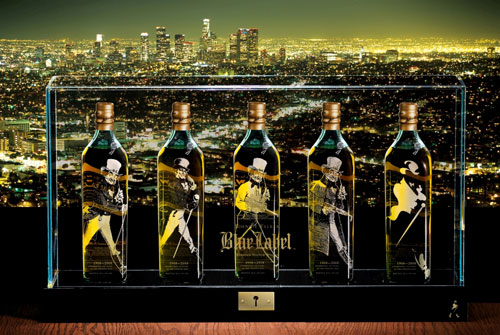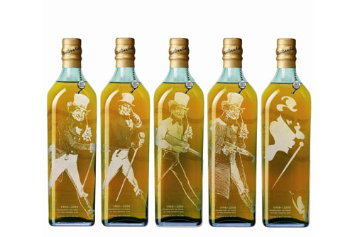 為慶祝「邁步向前的紳士」問世滿百年,JOHNNIE WALKER藍牌特別推出頂級尊榮的「JOHNNIE WALKER藍牌-百年紀念典藏版」。每組「JOHNNIE WALKER藍牌-百年紀念典藏版」共有五瓶JOHNNIE WALKER藍牌頂級威士忌,每一瓶瓶身正面以手工細膩雕刻百年來不同時期的「邁步向前的紳士」圖像,瓶身背面貼上JOHNNIE WALKER經典斜標,收藏在如同水晶般清透的珍藏盒中,每組配有專屬編號及鎖匙。